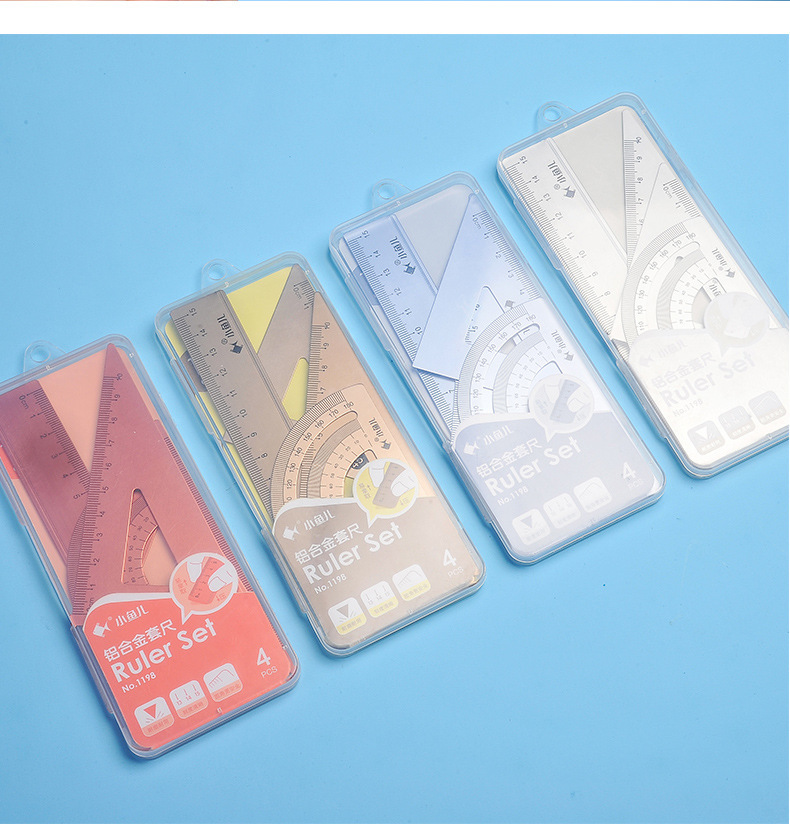 小魚1198アルミニウム合金四本物差し学生金属ins風シンプル透明ケース四点セット尺