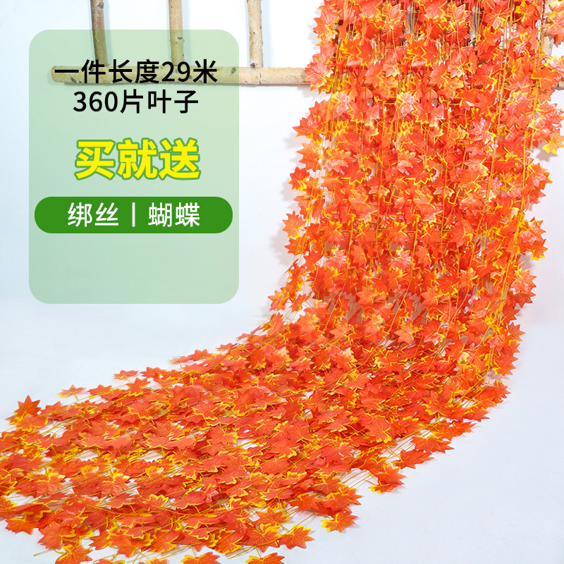 赤いカエデの葉の枝、花、籐の天井装飾、偽の木の葉、公園の造園、緑の植物、壁掛け、窓