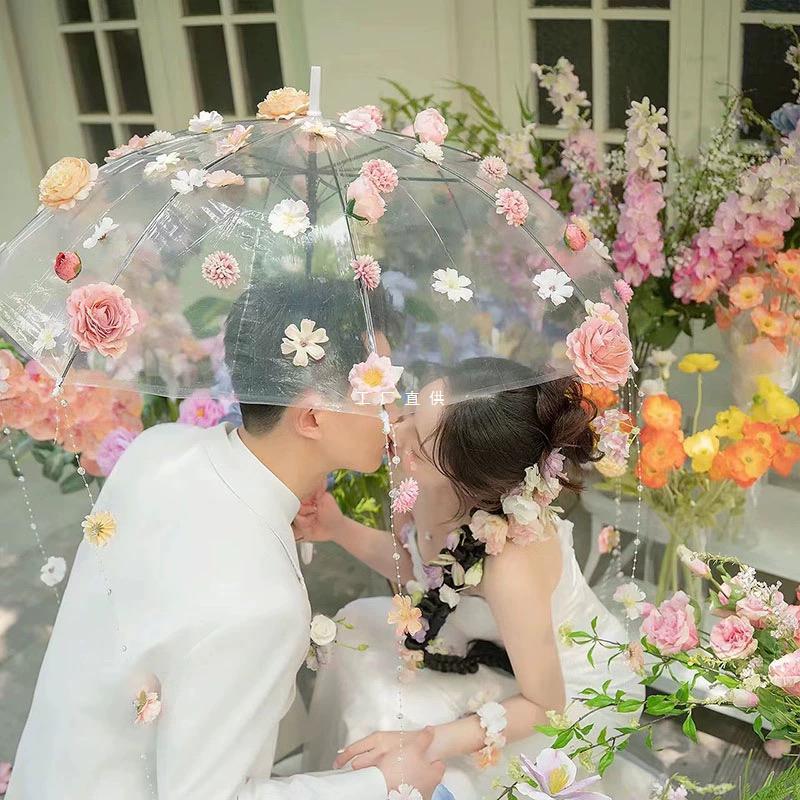 新型のウェディングドレスの撮影道具の花の傘は花の透明な傘にくっつきます。