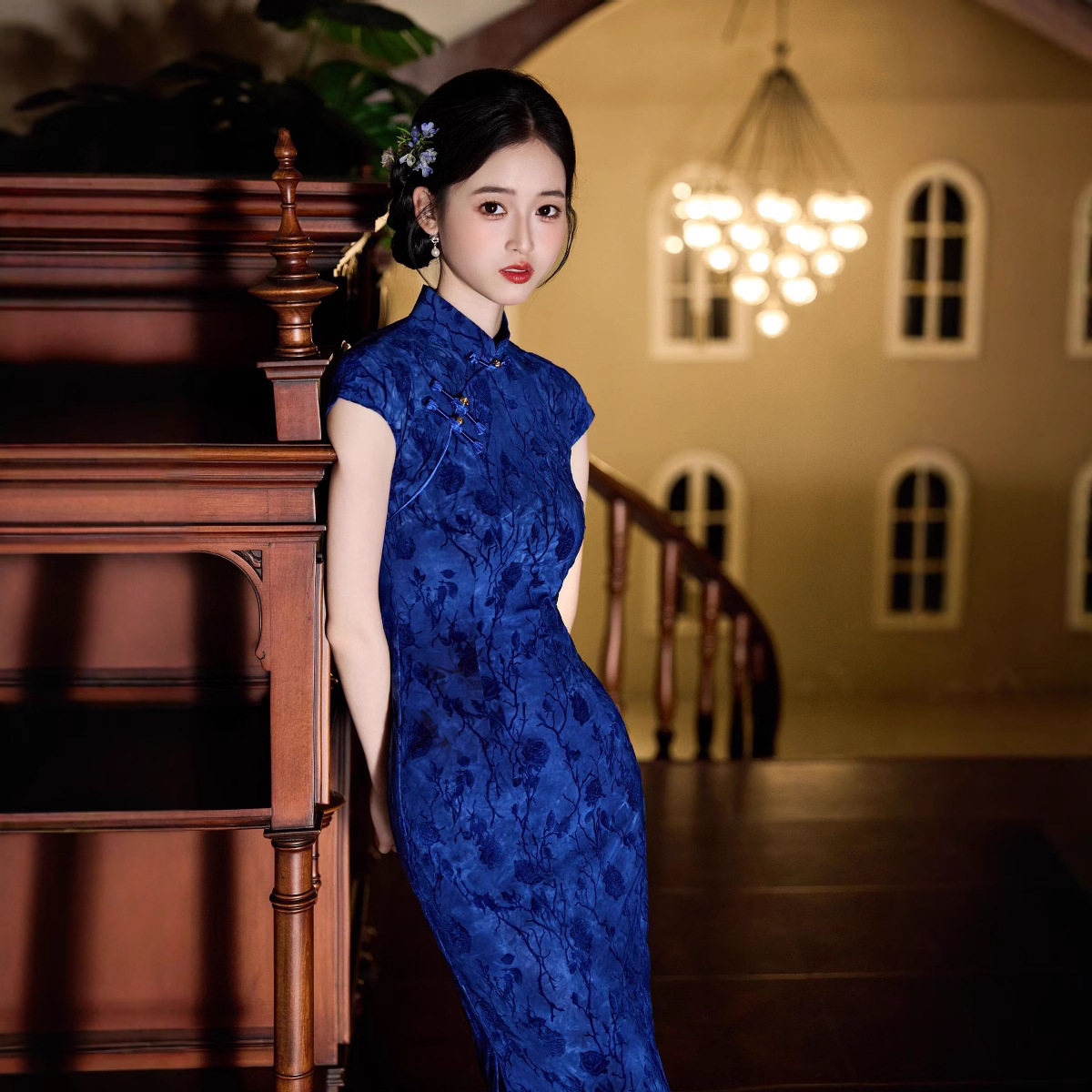 2025 新しい夏のチャイナドレスブルー高貴な気質エレガントなチャイナドレススタンドカラーノースリーブスリムフィットキャットウォークチャイナドレス