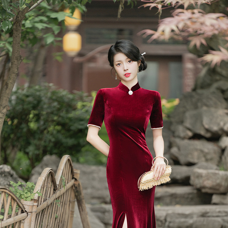 6087雲嵐絨毛秋の新型チャイナドレスの小さいロングタイプの修身気質チャイナドレスの七分袖が痩せています。