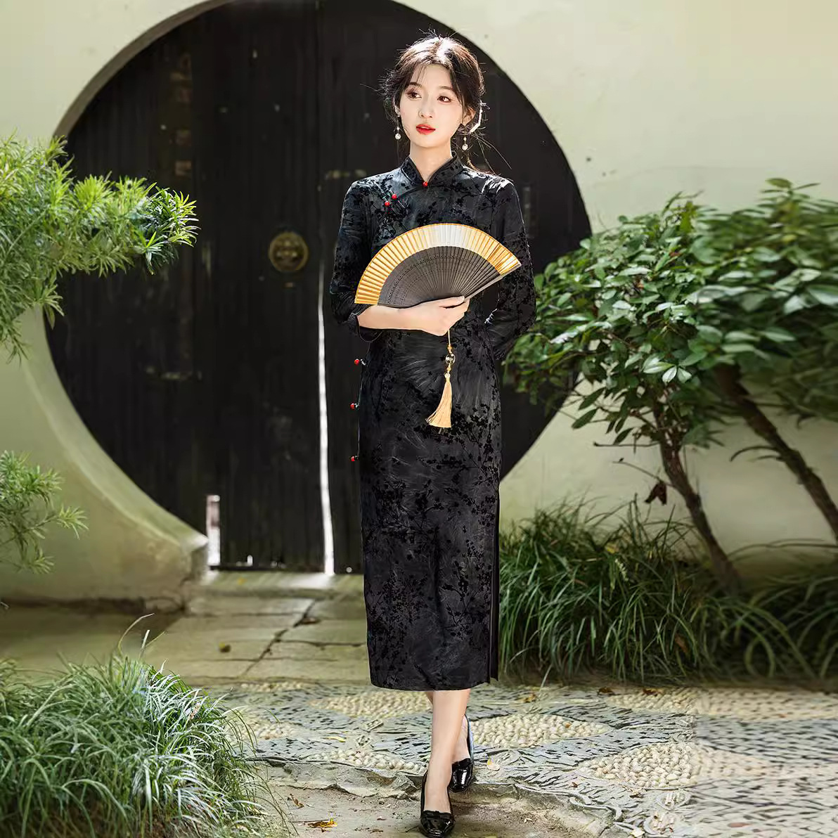 2025春夏新作チャイナドレス韓国絨毯新中国風復古民国風黒チャイナドレス改良修身長チャイナドレス