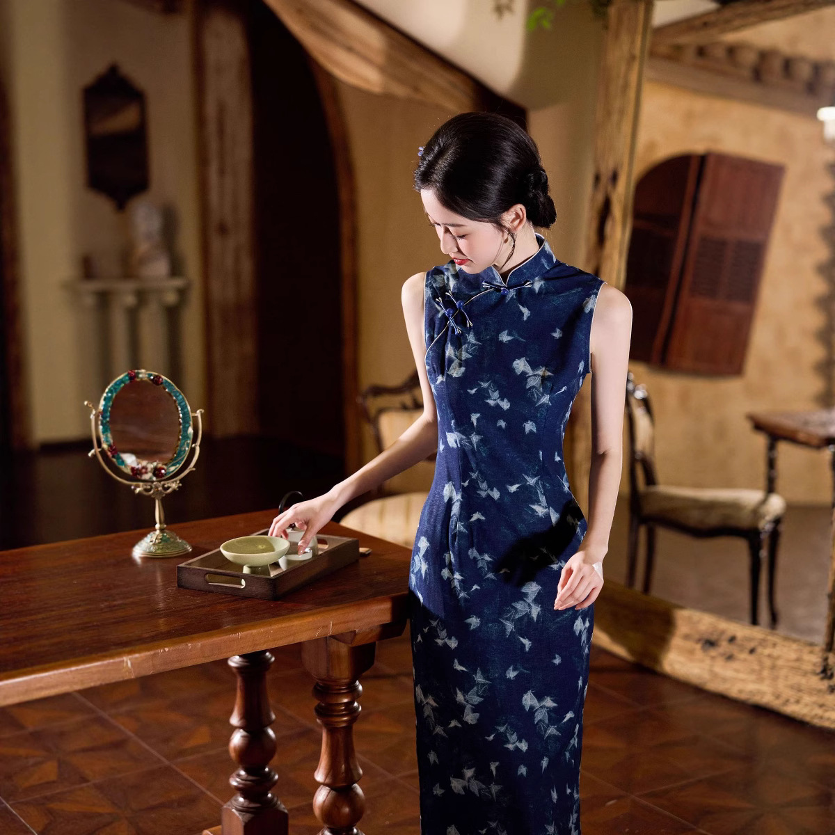 2025 新しい夏のチャイナドレス新中国風シルクとリネンロングブルーノースリーブチャイナドレスデイリースリム女性のチャイナドレス