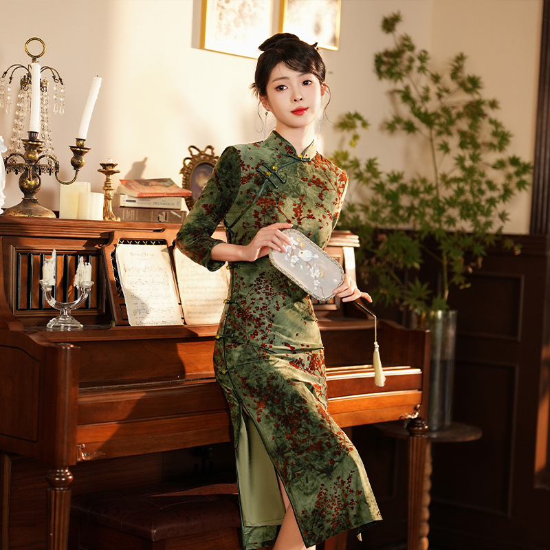 3165プリント旗袍人気商品、中華民国風レトロ旗袍ワンピース、ハイカットスリット入り、スリムフィット、薄手の花柄ベルベット素材