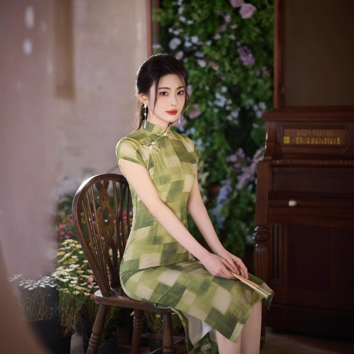 2025春夏の新型グリーンチャイナドレスの若いスタイルの気質はチャイナドレスを身に着けています。