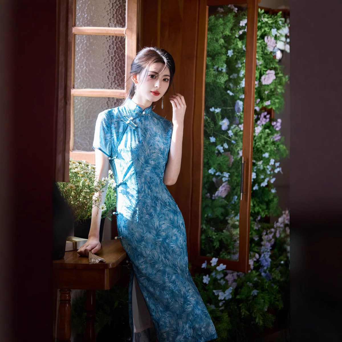 2025春夏の新型レトロな民族風の長いタイプのオーダイのチャイナドレスは新しい中国式の日常のネットの糸の青いチャイナドレスを改良します。