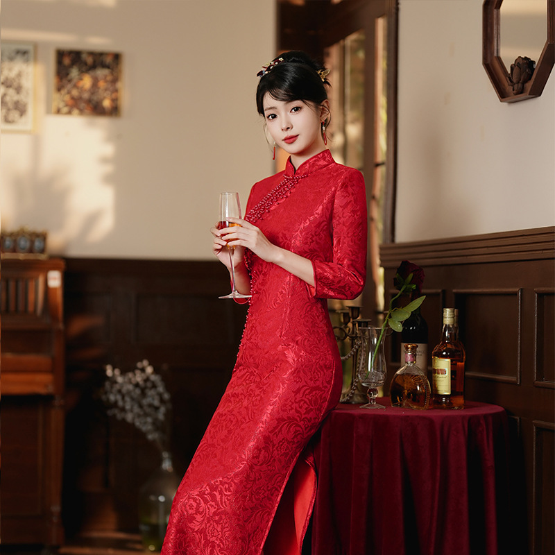 3191紅装秋冬新作チャイナドレス長型七分袖気質レース手作り釘珠修身高開フォーク単層