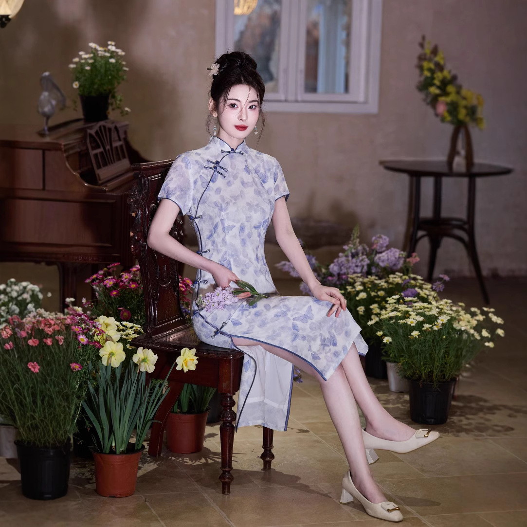 2025春夏新作チャイナドレス新中国風ブルーチャイナドレス花が咲き、高級女性チャイナドレスの現物をプレゼントします。