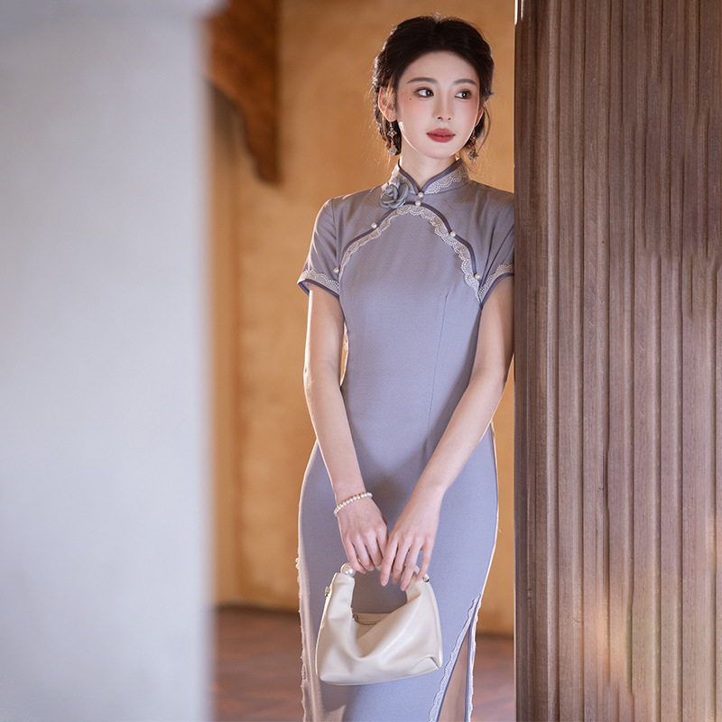 2025春夏新作チャイナドレス中国風浅紫修身ロングタイプのチャイナドレスシンプルな雰囲気半袖古法チャイナドレス