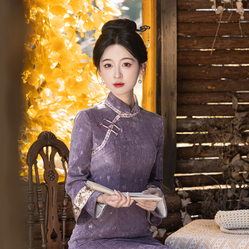 2024年新型シェニール高級紫チャイナドレス新中国式倒大袖修身チャイナドレス改良民国チャイナドレス