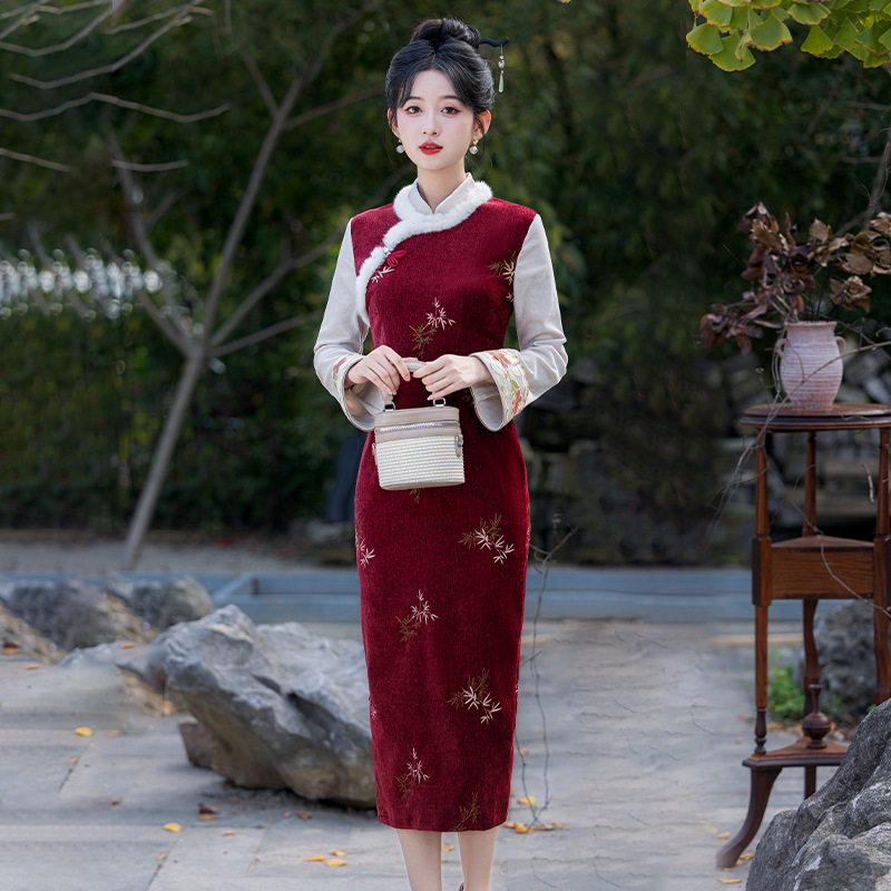 2024冬の新型ベルベットチャイナドレス新中国式偽ジャカード2枚の若いモデルの絶美チャイナドレスの現物