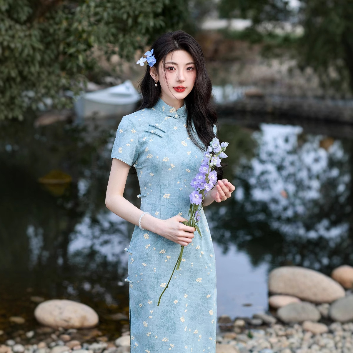 2025春夏新作チャイナドレス高級感ブルー古法チャイナドレス改良版上海レトロ修身女性チャイナドレス