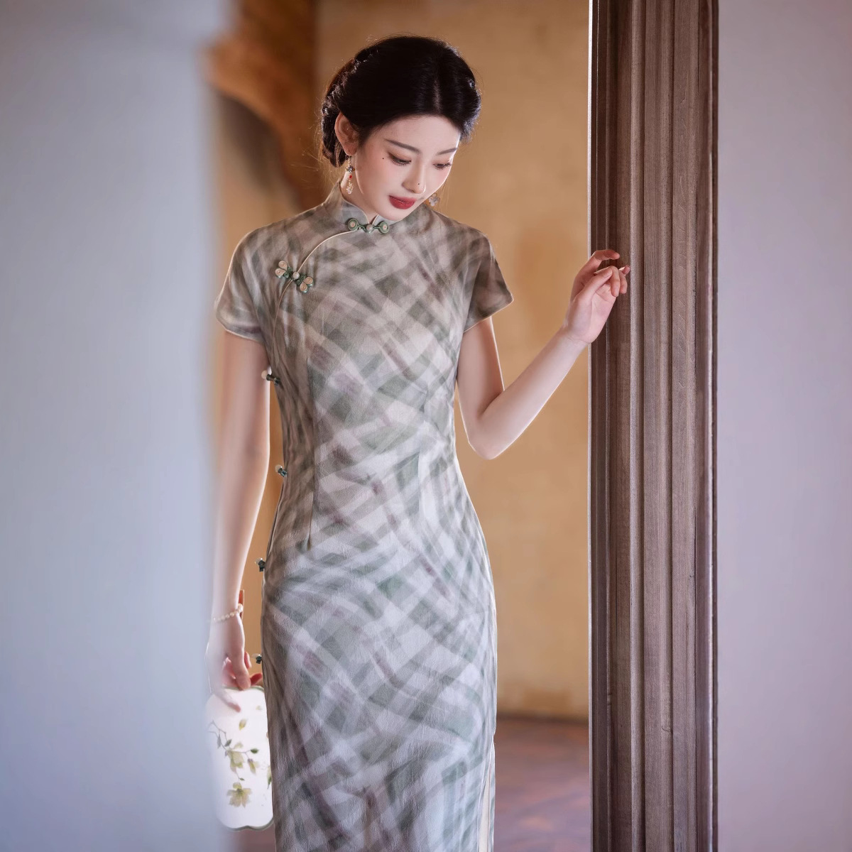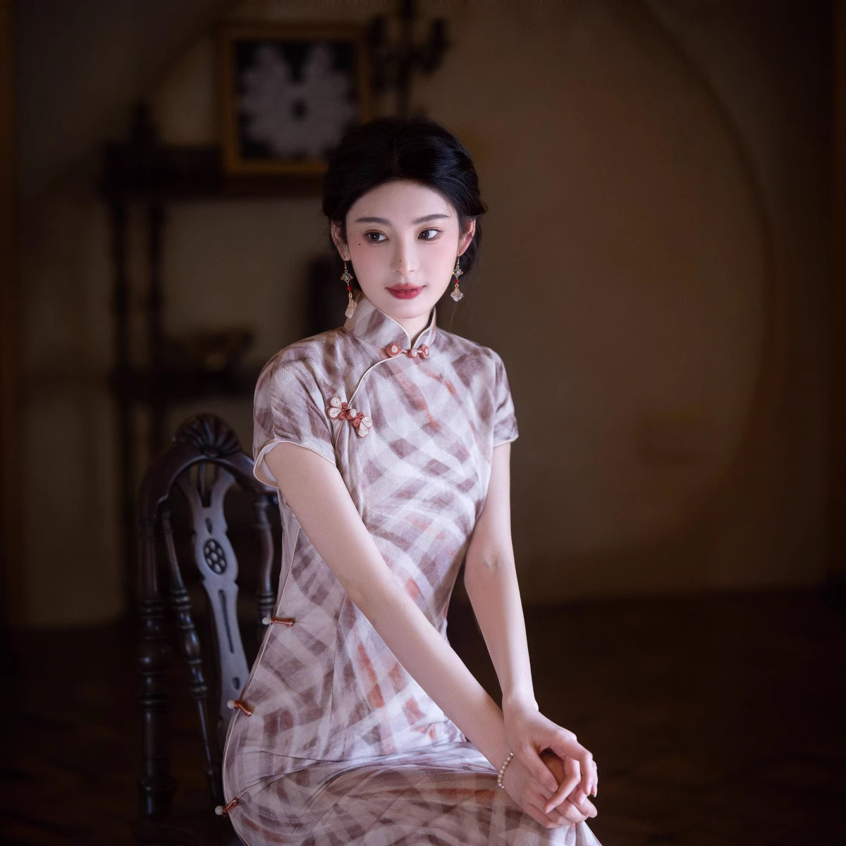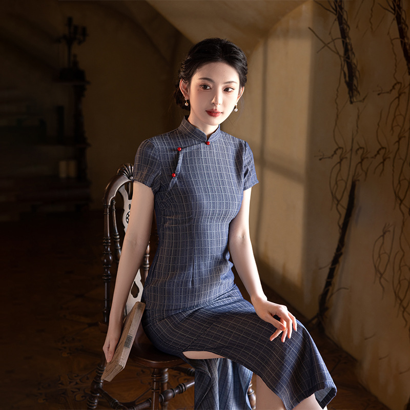 2025春夏新作チャイナドレス民国風長型格子修身日常チャイナドレス若手半袖文芸チャイナドレス
