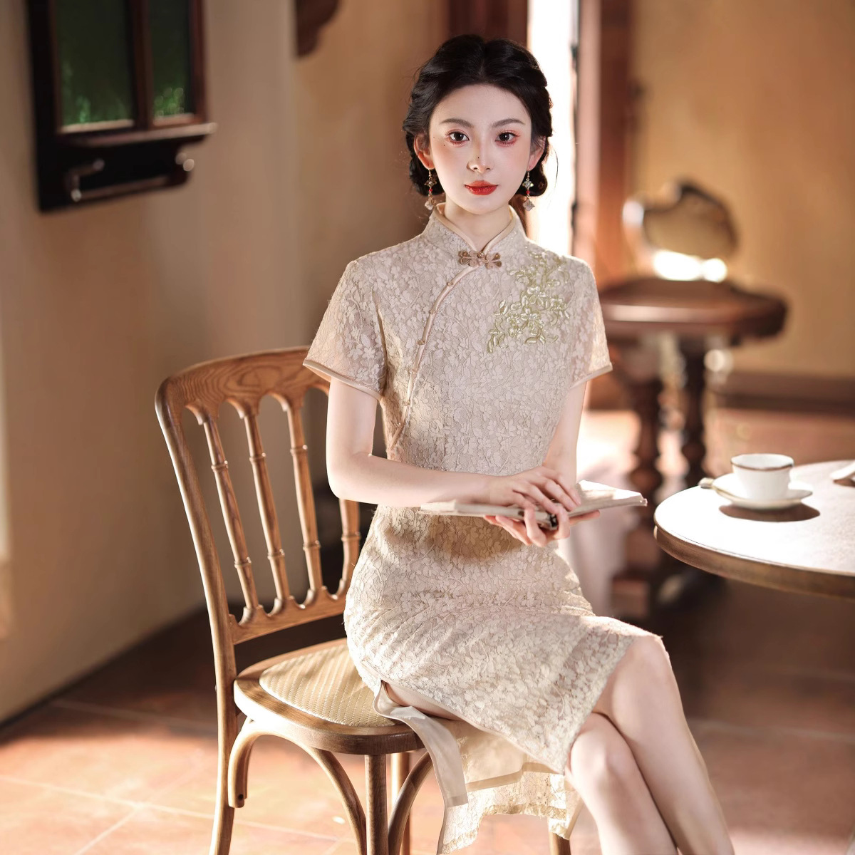 2025春夏新作チャイナドレス新中国式高級気質レースチャイナドレス淑女範ミディアムベージュ女性チャイナドレス
