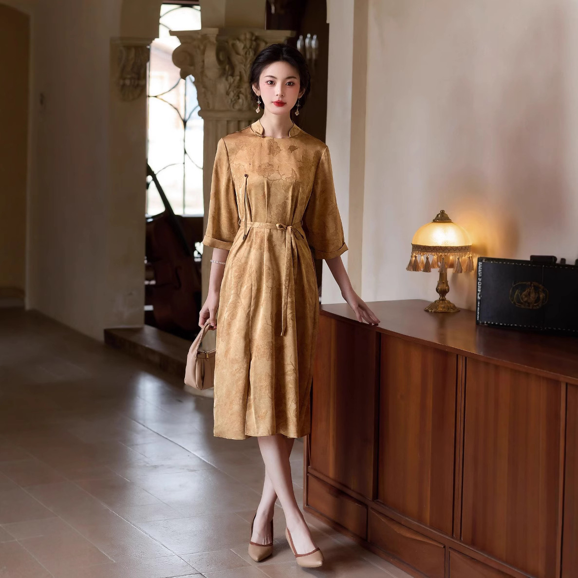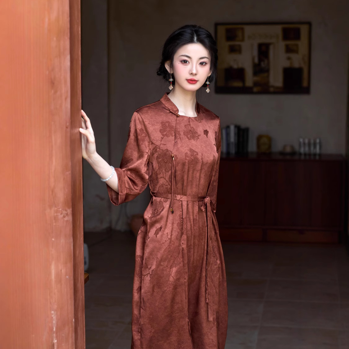 2025春夏の新型チャイナドレスの優雅な気質の绢糸は腰のチャイナドレスの新中国式の復古の民国風の女性のチャイナドレスを収めます。