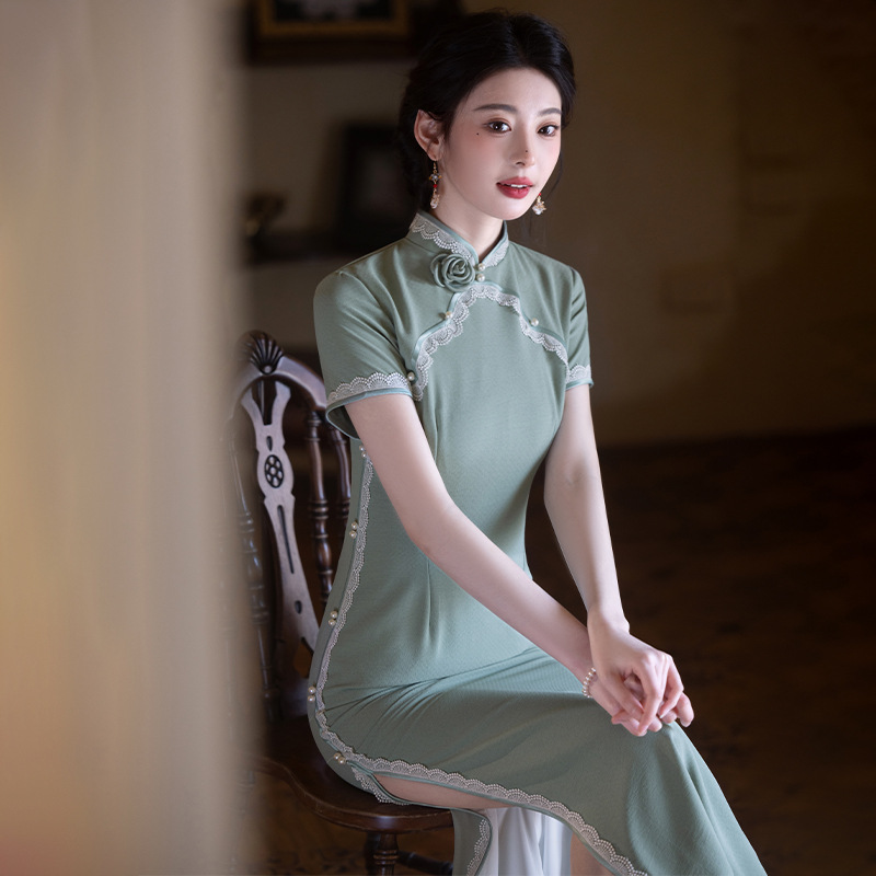 2025春夏の新型チャイナドレス新中国式緑の優雅な修身チャイナドレスのレースの花の若いチャイナドレス