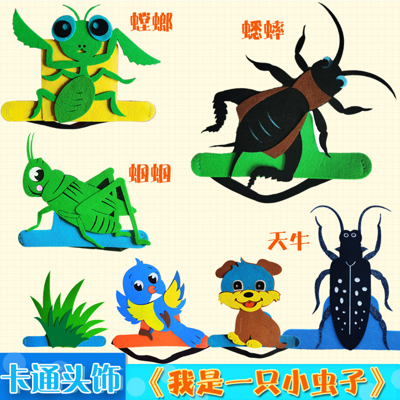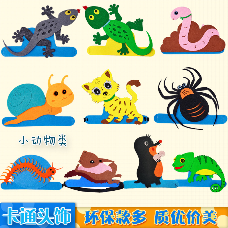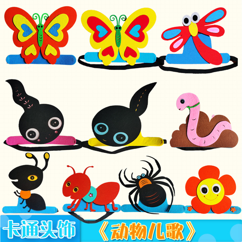 子供の日の幼稚園の漫画の動物の頭は道具のミミズのカタツムリのクモのムカデのトカゲの頭を飾って帽子をかぶせます。