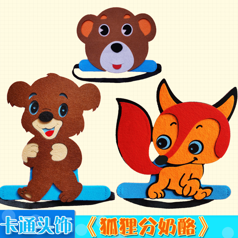 キツネはチーズの頭飾りの道具を分けて熊の漫画の帽子の幼稚園は劇の小動物の頭を演じて子供の日をかぶせます。