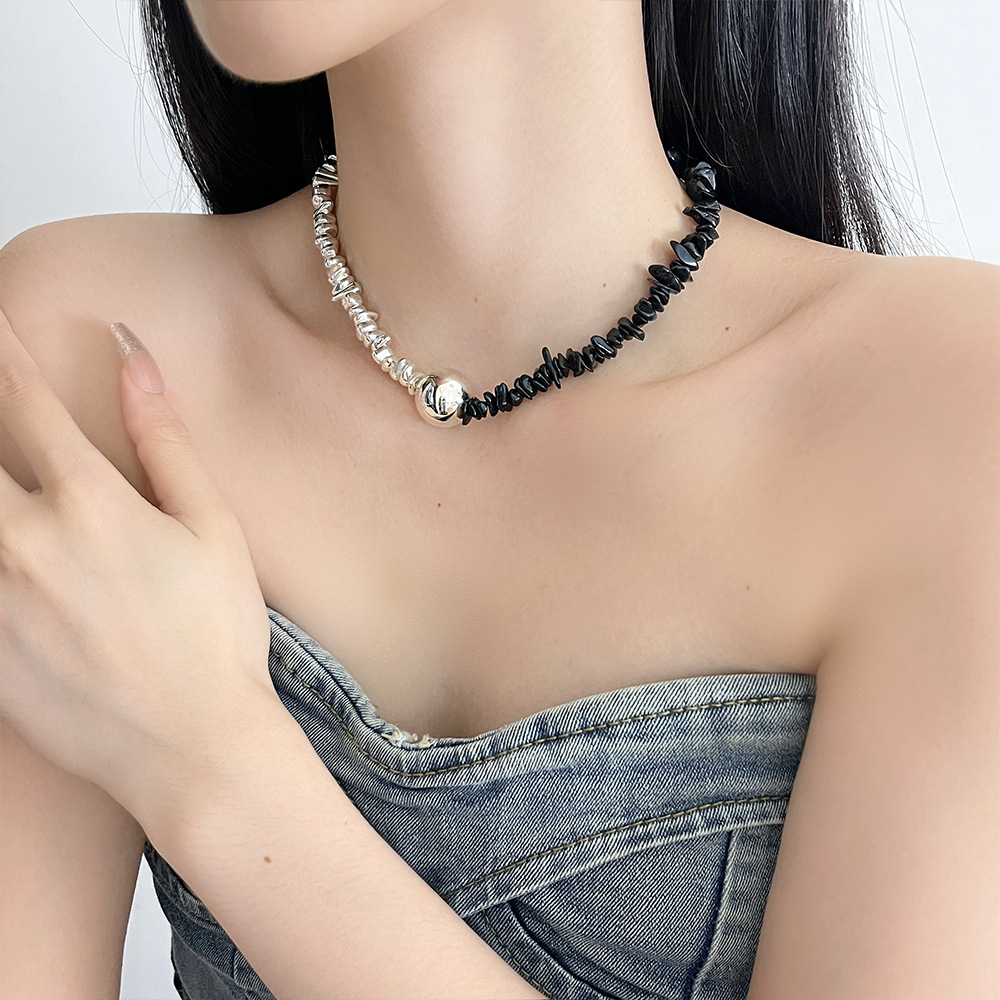 暗黒風ギャルボール黒銀衝突色不規則砂利ビーズネックレスヒップホップパンク非対称鎖骨チェーン