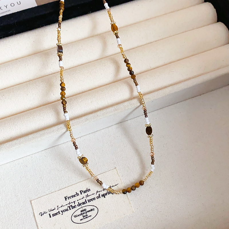 虎眼樹脂米珠ビーズネックレス中古風気質カレー色セーターチェーン復古美ラードアクセサリー卸売り
