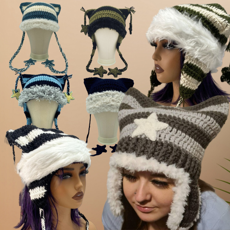 Ins手作りニット猫耳星流蘇毛辺毛糸帽保温防風縞帽子百合包耳帽