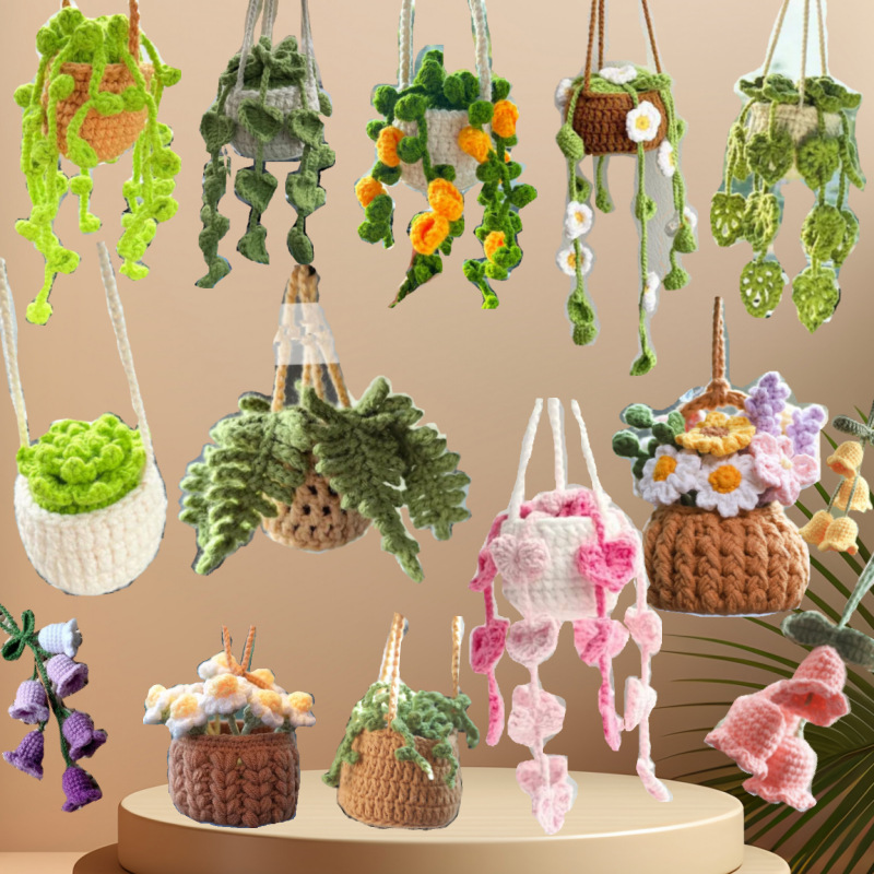 2025年新型車載飾り 手編み吊蘭鉢植え 毛糸製ペンダント 車のバックミラー用クリエイティブペンダント