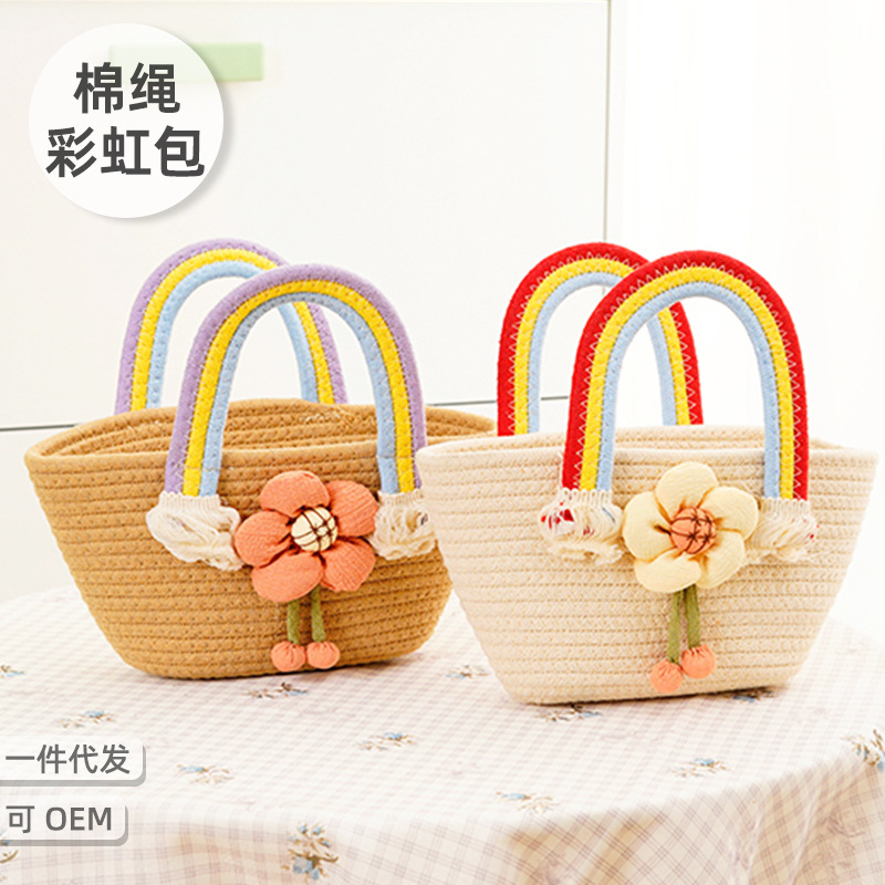 綿の縄のハンドバッグの虹のカバンのファッションは簡単で清新で甘い休暇旅行のハンドバッグの編み物のお土産の贈り物です。