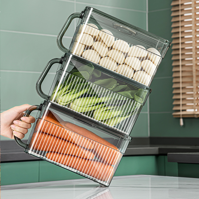 新しいpetハンドル付き冷蔵庫収納ケース透明キッチン家庭用タイミング保水プラスチック収納ケース