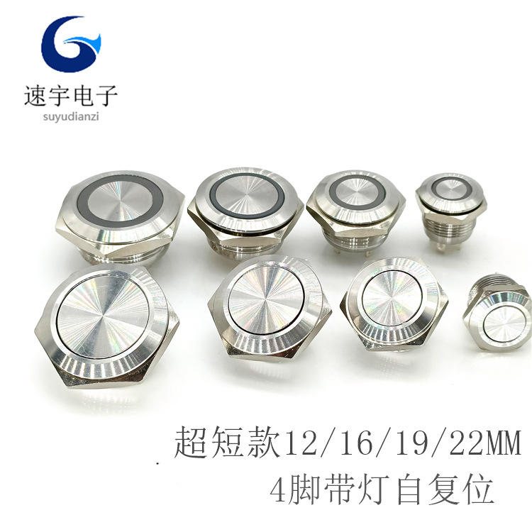 超薄型防水金属ボタンスイッチ12/16/19/22mm 4脚ランプ付きセルフリセット円形ボタン