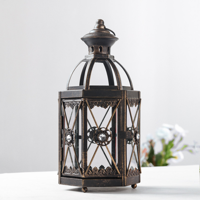 現物卸売りレトロな透かし彫りの鉄製の燭台の置物の大きいサイズのまっすぐな筒のガラスの防護は燭台の風灯を持ちます。
