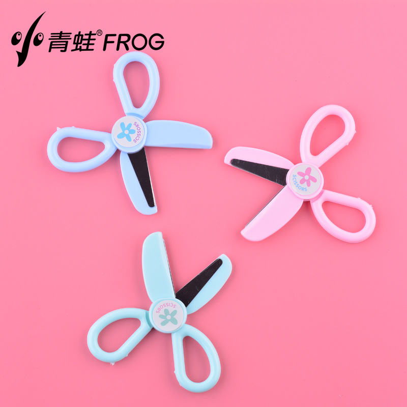 カエルの学生はプラスチックのマカロン色の安全なアートワークの文房具をはさみます。