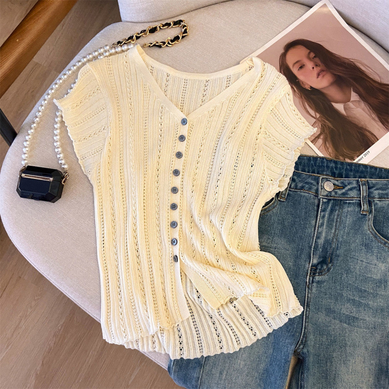 フレンチスタイルVネック中空ピットアイスシルクニットTシャツレディース夏新作小飛袖スタイル