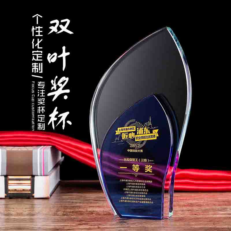 創意青と白の双葉水晶のトロフィーはオーダーメイドで彫刻します。