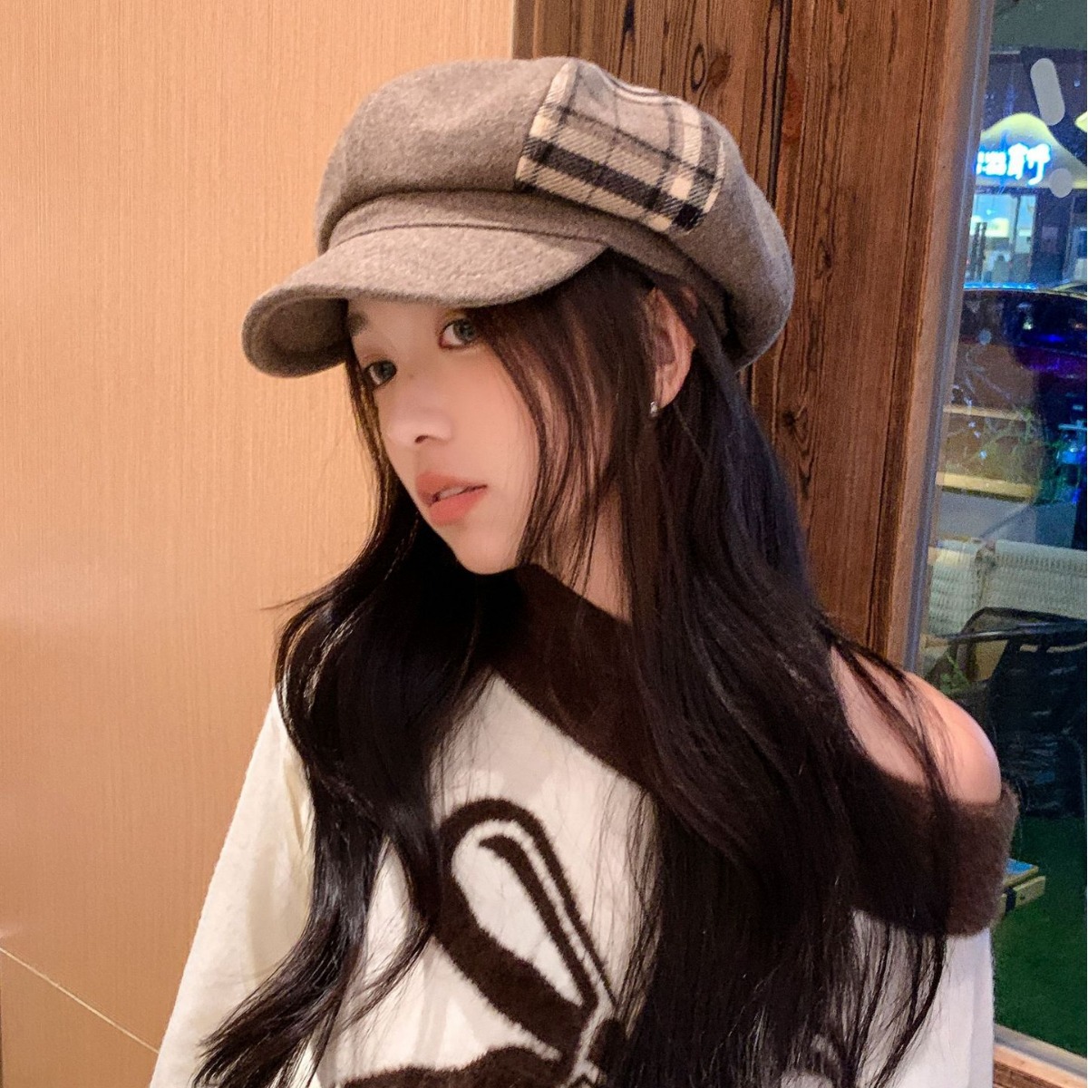 秋冬の新型保温八角帽子の女性ファッション金属チェーンのアヒルの舌の帽子の韓国版の大きい頭の周りの前に帽子のベレー帽を入れます。
