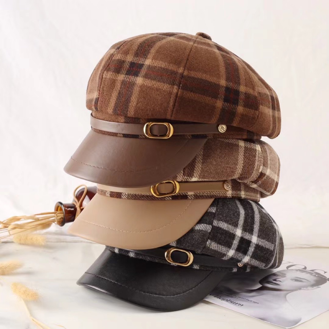 秋冬の新型の格子縞はpuの皮の軒の八角の帽子をつなぎ合わせます。