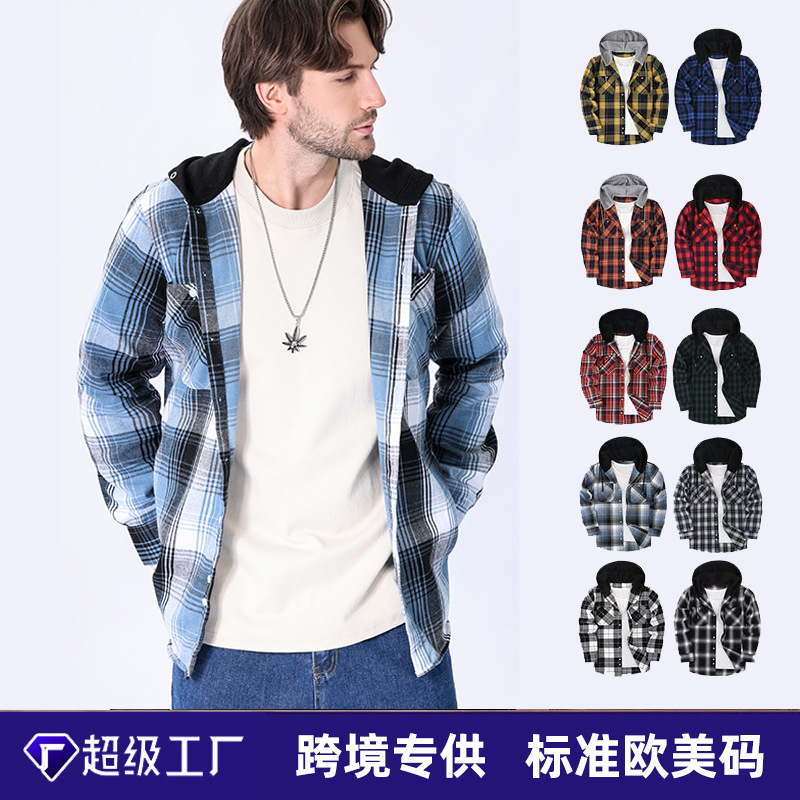 クロスボーダー人気ベルベットフード付きチェック柄シャツメンズ長袖暖かいメンズチェック柄シャツ大きいサイズ紳士服卸売