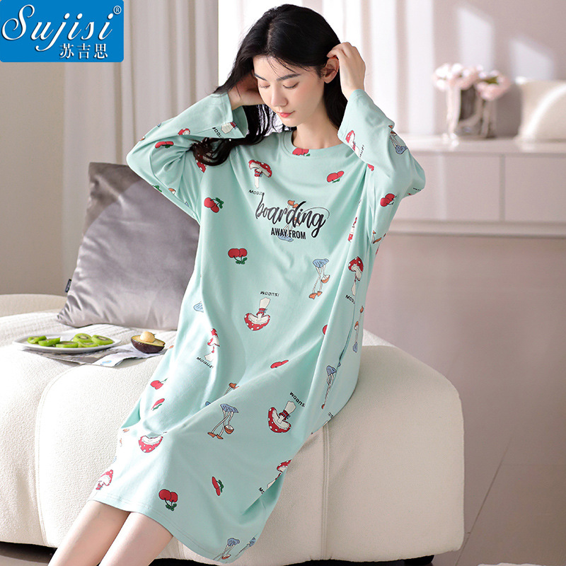 秋の純綿の寝スカートの女性の2023新型の中で長いタイプのカジュアルなワンピースの綿のプリントの長袖の家のスカート