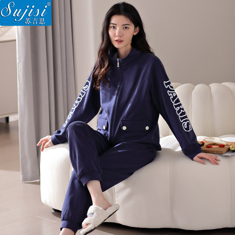 秋冬の女性のパジャマの綿100% の長袖のファスナーの純綿は厚くて快適です。