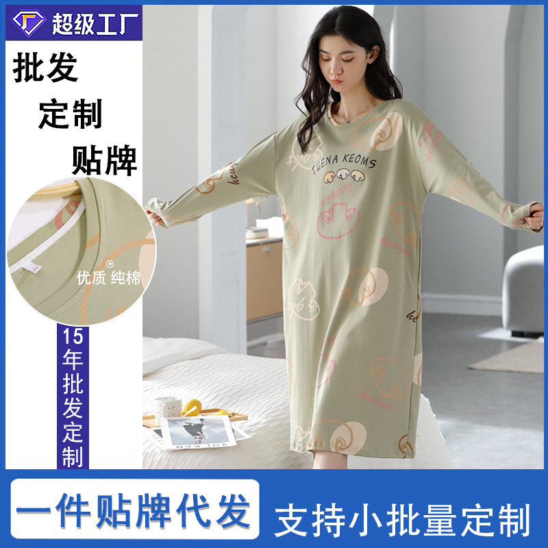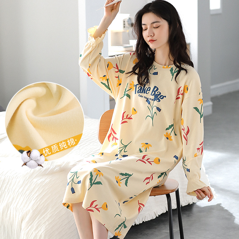 秋の新型純綿女性のパジャマスカートの中の長さの女性の長袖の丸首は快適で甘いです。