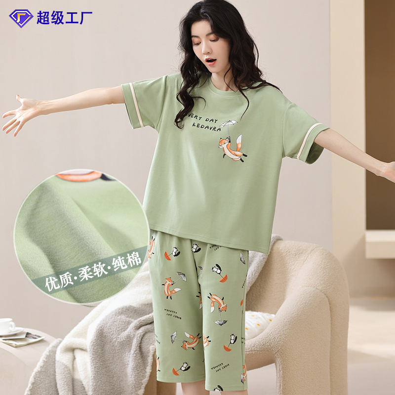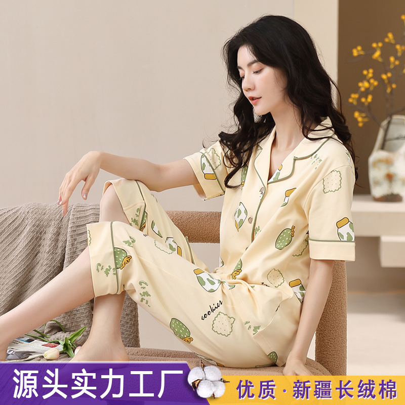 夏の女性の純綿パジャマ五分袖七分ズボン綿カーディガン
