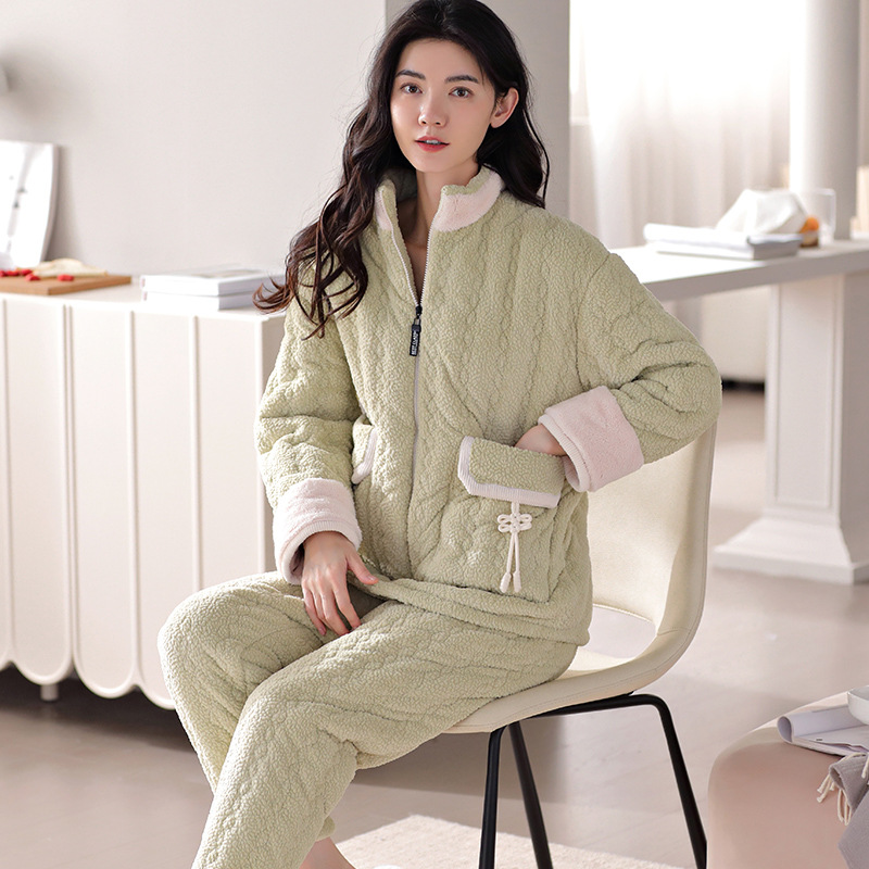 新型パジャマ女性冬カーディガンフランネル三層綿を厚くしてカジュアルな大サイズの家庭セットを着ることができる