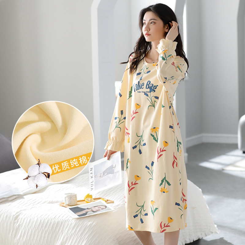 ミディアムロング純綿長袖パジャマ女性春と秋のゆるい丸首ワンピースパジャマの薄い家庭服セット