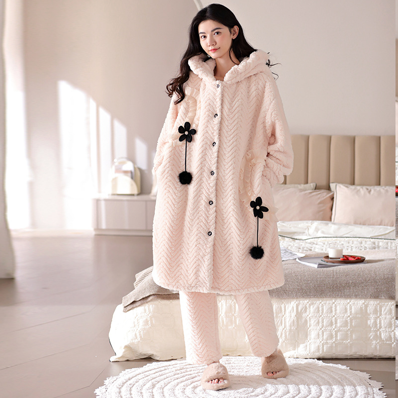 新しいパジャマ女性冬のミルクベルベットの花のカーディガンは綿とベルベットを挟んで厚くして、カジュアルな家庭セットを着ることができる