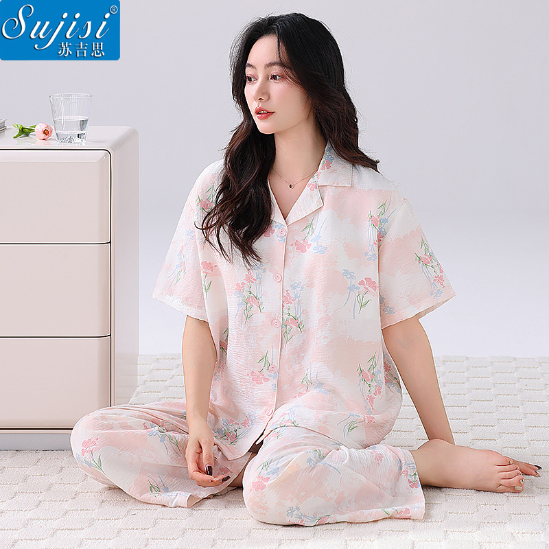 女性用純綿パジャマ、胸パッド付き夏の新作カーディガン、半袖ズボン、綿ホーム服、屋外で着用できる2点セット