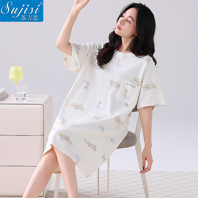 新商品の女性のパジャマの綿の女性の中で長いタイプの夏の純綿の女性のゆったりした丸首の家の服のパジャマの女性の夏
