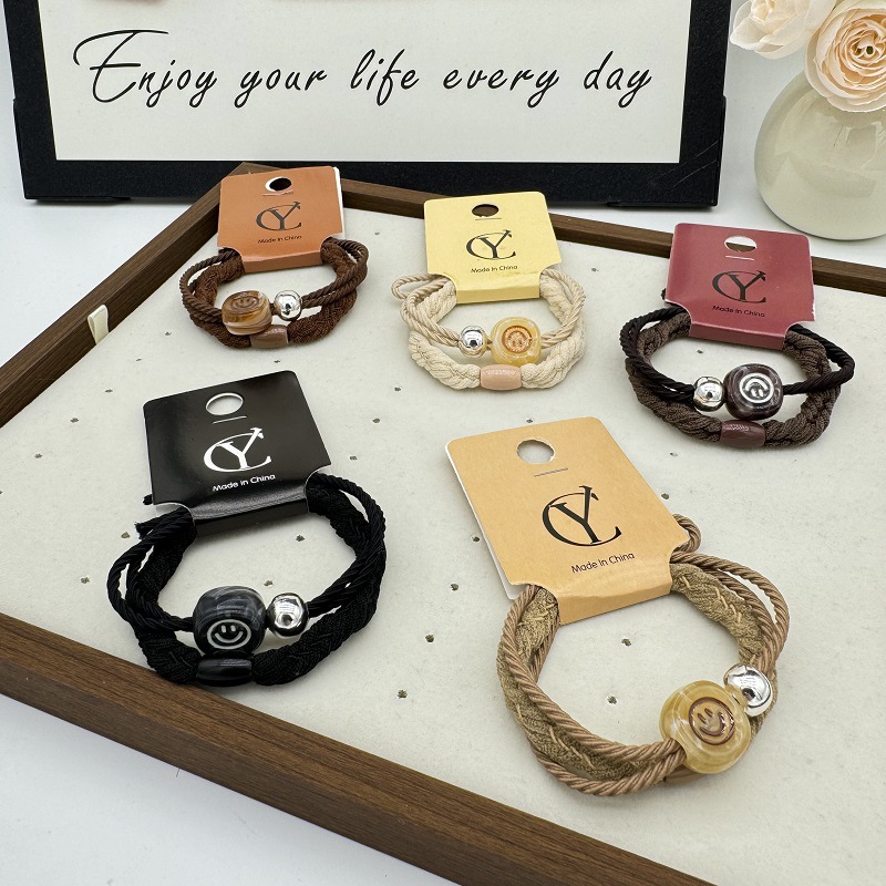 カラフルなミックスカード、シンプルなスマイリーフェイスラベル、ヘアバンド、手編み三つ編みヘアロープ、パールゴムバンドヘアアクセサリー
