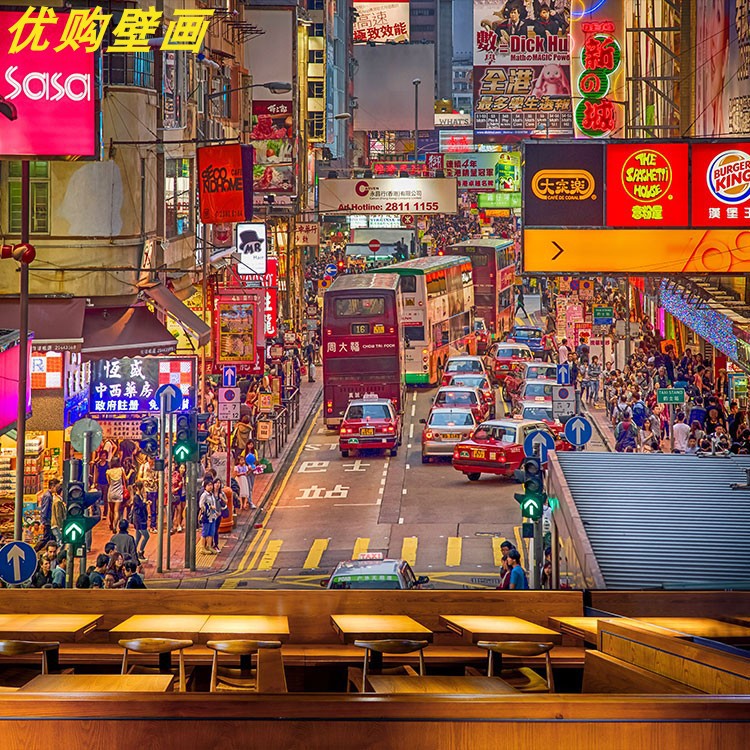 3d香港街景壁画香港式茶レストランレトロレトロ装飾壁布軽食店自己接着夜景壁壁紙