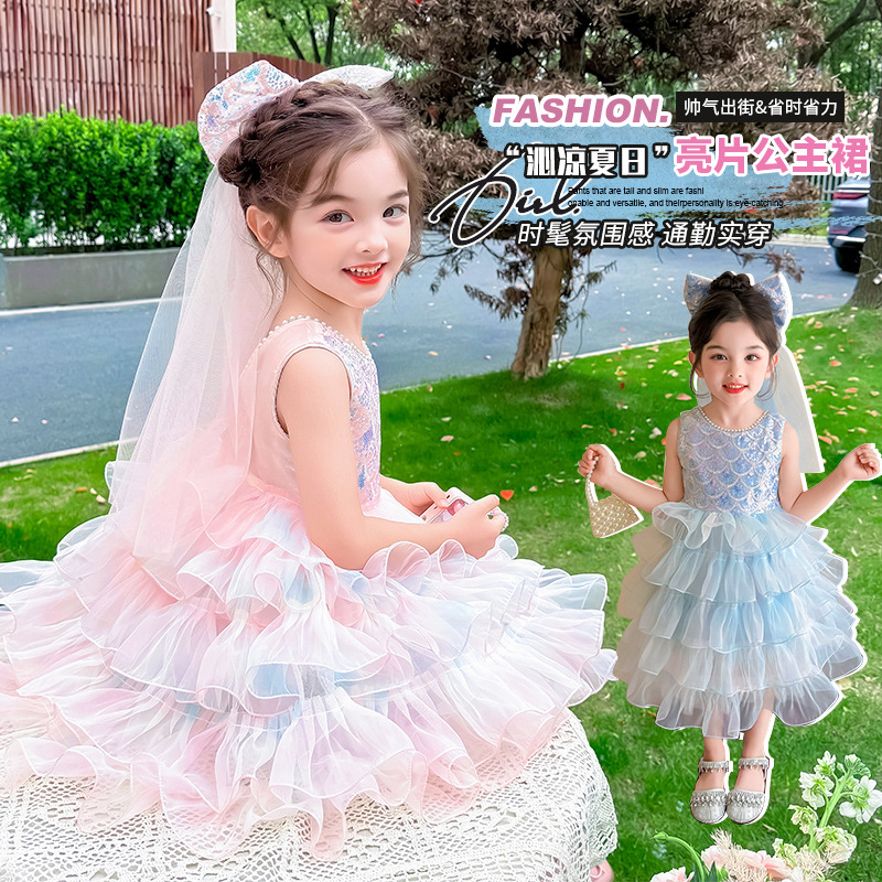女の子マーメイドドレススパンコールケーキスカートサマードレス2025新しいスタイル子供エルサプリンセスドレスパフォーマンスドレス
