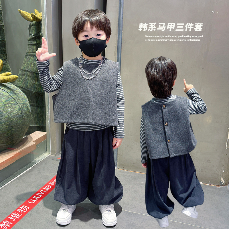 男児スーツ春秋モデル2025春装新流行洋風ファッション児童tシャツ馬甲ズボン3点セット