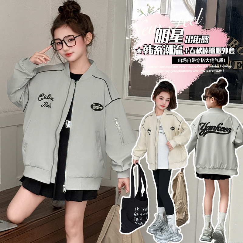 女の子コート春秋2025新型子供春の洋風カジュアル上着の中の子供が街の春の野球服を揚げます。